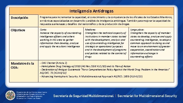 Inteligencia Antidrogas Descripción Programa para incrementar la capacidad, el conocimiento y la competencia de los oficiales de los Estados Miembros, en técnicas especializadas en desarrollo y análisis de inteligencia antidrogas. También para mejorar la capacidad de respuesta a amenazas y desafíos del narcotráfico y de la producción de drogas. Objetivos Corto: Increase the capacity of counterdrug intelligence officers and others working in this area to gather information then develop, analyze and apply the resultant intelligence Mandatos de la OEA: - OAS Charter (Article 2) - Hemisphere Drug Strategy of 2010 (AG Res 2556 XLO/10) and its Plan of Action - Declaration of Antigua Guatemala “For a Comprehensive Policy Against the World Drug Problem in the Americas” AG/DEC. 73 (XLIII-0/13) - Advancing Hemispheric Security: A Multidimensional Approach AG/RES. 2809 (XLIII-0/13) Mediano: Strengthen the technical capacity of institutions in member states tasked with the development, analysis and use of counterdrug intelligence for strategic or operational purposes and in the development of programs and policies related to the control of drugs Largo plazo: Strengthen the capacity of member states to develop, analyze and apply counterdrug intelligence, to adopt a common approach to doing so and move to an environment of greater cooperation, coordination and information exchange in counterdrug efforts