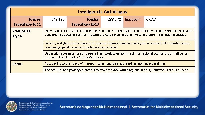Inteligencia Antidrogas Fondos Específicos 2012 Principales logros 246, 189 Fondos Específicos 2013 233, 272 Ejecutor: CICAD Delivery of 3 (four-week) comprehensive and accredited regional counterdrug training seminars each year delivered in Bogota in partnership with the Colombian National Police and other international entities Delivery of 4 (two-week) regional or national training seminars each year in selected OAS member states concerning specific counterdrug techniques or issues Undertaking consultations and preliminary work to establish a similar regional counterdrug intelligence training school initiative for the Caribbean Retos: Responding to the needs of member states regarding counterdrug intelligence training The complex and prolonged process to move forward with a regional training initiative in the Caribbean