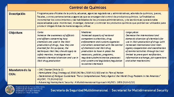 Control de Químicos Descripción Programa para oficiales de la policía, aduanas, agencias reguladoras y administrativas, además de químicos, jueces, fiscales, y otros pertenecientes a agencias que se encargan del control de productos químicos. La finalidad es incrementar los conocimientos y las habilidades de los procesos administrativos, y de las técnicas operacionales especializadas para: monitorear, investigar, detectar y controlar los productos químicos que podrían ser utilizados para producir drogas ilícitas de manera segura y eficaz. Objetivos Corto: Increase the awareness of officials and officers concerning how chemicals are used in the illicit production of drugs, how they are diverted for this purpose, the techniques that they should apply to safely monitor, investigate and interdict chemical diversion and use in illicit drug production Mandatos de la OEA: - OAS Charter (Article 2) - Hemisphere Drug Strategy of 2010 (AG Res 2556 XLO/10) and its Plan of Action - Declaration of Antigua Guatemala “For a Comprehensive Policy Against the World Drug Problem in the Americas” AG/DEC. 73 (XLIII-0/13) - Advancing Hemispheric Security: A Multidimensional Approach AG/RES. 2809 (XLIII-0/13) Mediano: Increased capacity of national competent authorities, drug enforcement and customs agencies and others concerned with the control of chemicals and illicit drug production to have in place the necessary, policies, programs, regulatory/administrative processes and system and legislation/regulation to control chemicals Largo plazo: Decrease the international and domestic diversion of chemicals for use in illicit production of drugs with increased international and interagency cooperation and coordination of control activities through but not limited to pre-export notification, information exchange, join operations and other mechanisms