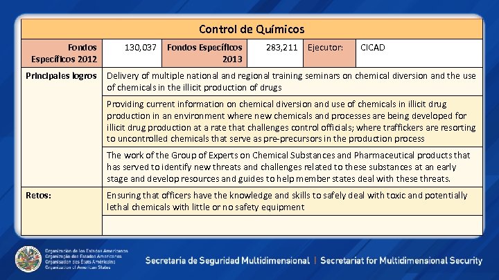 Control de Químicos Fondos Específicos 2012 Principales logros 130, 037 Fondos Específicos 2013 283, 211 Ejecutor: CICAD Delivery of multiple national and regional training seminars on chemical diversion and the use of chemicals in the illicit production of drugs Providing current information on chemical diversion and use of chemicals in illicit drug production in an environment where new chemicals and processes are being developed for illicit drug production at a rate that challenges control officials; where traffickers are resorting to uncontrolled chemicals that serve as pre-precursors in the production process The work of the Group of Experts on Chemical Substances and Pharmaceutical products that has served to identify new threats and challenges related to these substances at an early stage and develop resources and guides to help member states deal with these threats. Retos: Ensuring that officers have the knowledge and skills to safely deal with toxic and potentially lethal chemicals with little or no safety equipment
