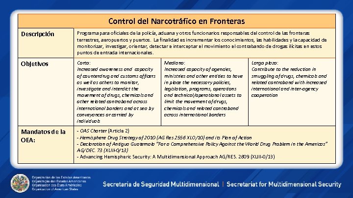 Control del Narcotráfico en Fronteras Descripción Programa para oficiales de la policía, aduana y otros funcionarios responsables del control de las fronteras terrestres, aeropuertos y puertos. La finalidad es incrementar los conocimientos, las habilidades y la capacidad de monitorizar, investigar, orientar, detectar e interceptar el movimiento el contrabando de drogas ilícitas en estos puntos de entrada internacionales. Objetivos Corto: Increased awareness and capacity of counterdrug and customs officers as well as others to monitor, investigate and interdict the movement of drugs, chemicals and other related contraband across international borders and at sea by conveyances or carried by individuals Mandatos de la OEA: - OAS Charter (Article 2) - Hemisphere Drug Strategy of 2010 (AG Res 2556 XLO/10) and its Plan of Action - Declaration of Antigua Guatemala “For a Comprehensive Policy Against the World Drug Problem in the Americas” AG/DEC. 73 (XLIII-0/13) - Advancing Hemispheric Security: A Multidimensional Approach AG/RES. 2809 (XLIII-0/13) Mediano: Increased capacity of agencies, ministries and other entities to have in place the necessary policies, legislation, programs, operations and technical/operational assets to limit the movement of drugs, chemicals and related contraband across international borders Largo plazo: Contribute to the reduction in smuggling of drugs, chemicals and related contraband with increased international and inter-agency cooperation