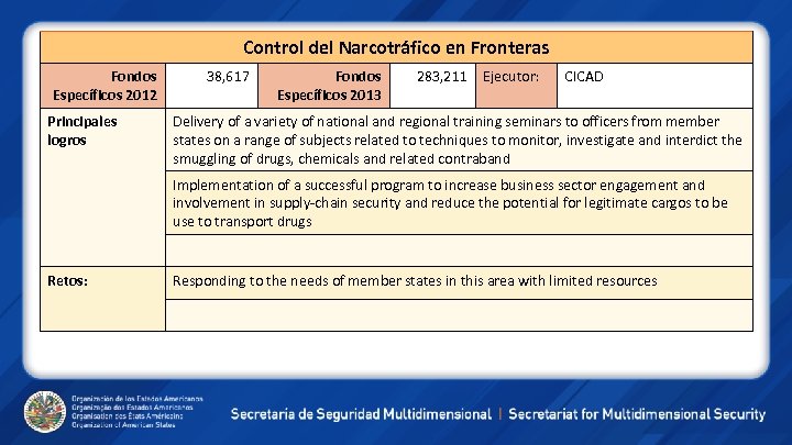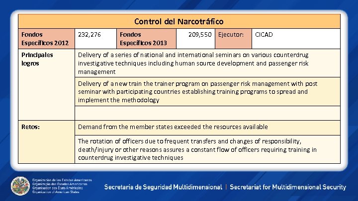 Control del Narcotráfico Fondos Específicos 2012 232, 276 Fondos Específicos 2013 209, 550 Ejecutor: CICAD Principales logros Delivery of a series of national and international seminars on various counterdrug investigative techniques including human source development and passenger risk management Delivery of a new train the trainer program on passenger risk management with post seminar with participating countries establishing training programs to spread and implement the methodology Retos: Demand from the member states exceeded the resources available The rotation of officers due to frequent transfers and changes of responsibility, death/injury or other reasons assures a constant flow of officers requiring training in counterdrug investigative techniques