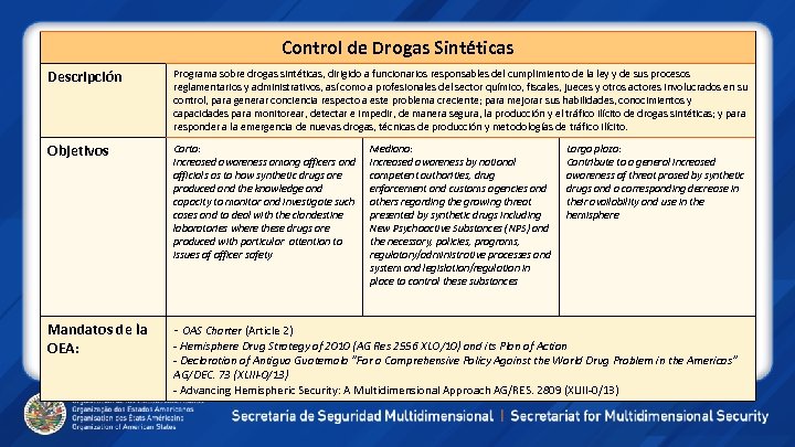 Control de Drogas Sintéticas Descripción Programa sobre drogas sintéticas, dirigido a funcionarios responsables del cumplimiento de la ley y de sus procesos reglamentarios y administrativos, así como a profesionales del sector químico, fiscales, jueces y otros actores involucrados en su control, para generar conciencia respecto a este problema creciente; para mejorar sus habilidades, conocimientos y capacidades para monitorear, detectar e impedir, de manera segura, la producción y el tráfico ilícito de drogas sintéticas; y para responder a la emergencia de nuevas drogas, técnicas de producción y metodologías de tráfico ilícito. Objetivos Corto: Increased awareness among officers and officials as to how synthetic drugs are produced and the knowledge and capacity to monitor and investigate such cases and to deal with the clandestine laboratories where these drugs are produced with particular attention to issues of officer safety Mandatos de la OEA: - OAS Charter (Article 2) Mediano: Increased awareness by national competent authorities, drug enforcement and customs agencies and others regarding the growing threat presented by synthetic drugs including New Psychoactive Substances (NPS) and the necessary, policies, programs, regulatory/administrative processes and system and legislation/regulation in place to control these substances Largo plazo: Contribute to a general increased awareness of threat prosed by synthetic drugs and a corresponding decrease in their availability and use in the hemisphere - Hemisphere Drug Strategy of 2010 (AG Res 2556 XLO/10) and its Plan of Action - Declaration of Antigua Guatemala “For a Comprehensive Policy Against the World Drug Problem in the Americas” AG/DEC. 73 (XLIII-0/13) - Advancing Hemispheric Security: A Multidimensional Approach AG/RES. 2809 (XLIII-0/13)