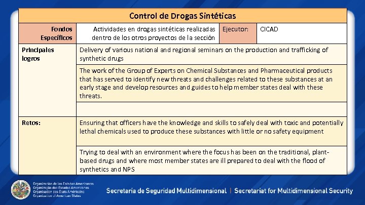 Control de Drogas Sintéticas Fondos Específicos Principales logros Actividades en drogas sintéticas realizadas Ejecutor: dentro de los otros proyectos de la sección CICAD Delivery of various national and regional seminars on the production and trafficking of synthetic drugs The work of the Group of Experts on Chemical Substances and Pharmaceutical products that has served to identify new threats and challenges related to these substances at an early stage and develop resources and guides to help member states deal with these threats. Retos: Ensuring that officers have the knowledge and skills to safely deal with toxic and potentially lethal chemicals used to produce these substances with little or no safety equipment Trying to deal with an environment where the focus has been on the traditional, plantbased drugs and where most member states are ill prepared to deal with the flood of synthetics and NPS