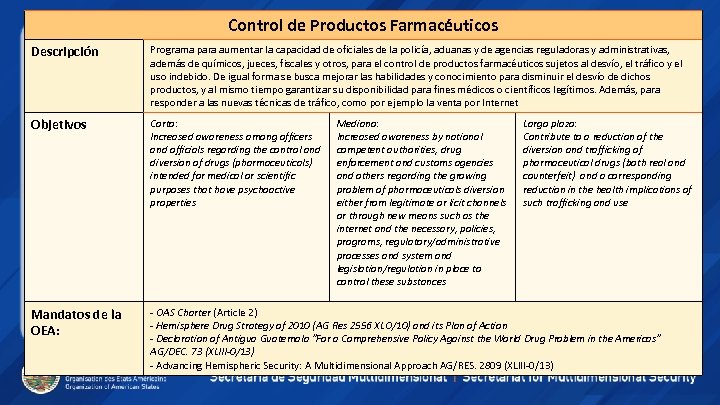 Control de Productos Farmacéuticos Descripción Programa para aumentar la capacidad de oficiales de la policía, aduanas y de agencias reguladoras y administrativas, además de químicos, jueces, fiscales y otros, para el control de productos farmacéuticos sujetos al desvío, el tráfico y el uso indebido. De igual forma se busca mejorar las habilidades y conocimiento para disminuir el desvío de dichos productos, y al mismo tiempo garantizar su disponibilidad para fines médicos o científicos legítimos. Además, para responder a las nuevas técnicas de tráfico, como por ejemplo la venta por Internet Objetivos Corto: Increased awareness among officers and officials regarding the control and diversion of drugs (pharmaceuticals) intended for medical or scientific purposes that have psychoactive properties Mandatos de la OEA: - OAS Charter (Article 2) - Hemisphere Drug Strategy of 2010 (AG Res 2556 XLO/10) and its Plan of Action - Declaration of Antigua Guatemala “For a Comprehensive Policy Against the World Drug Problem in the Americas” AG/DEC. 73 (XLIII-0/13) - Advancing Hemispheric Security: A Multidimensional Approach AG/RES. 2809 (XLIII-0/13) Mediano: Increased awareness by national competent authorities, drug enforcement and customs agencies and others regarding the growing problem of pharmaceuticals diversion either from legitimate or licit channels or through new means such as the internet and the necessary, policies, programs, regulatory/administrative processes and system and legislation/regulation in place to control these substances Largo plazo: Contribute to a reduction of the diversion and trafficking of pharmaceutical drugs (both real and counterfeit) and a corresponding reduction in the health implications of such trafficking and use