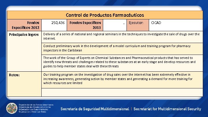 Control de Productos Farmacéuticos Fondos Específicos 2012 Principales logros 250, 436 Fondos Específicos 2013 - Ejecutor: CICAD Delivery of a series of national and regional seminars in the techniques to investigate the sale of drugs over the internet. Conduct preliminary work in the development of a model curriculum and training program for pharmacy inspectors in the Caribbean The work of the Group of Experts on Chemical Substances and Pharmaceutical products that has served to identify new threats and challenges related to these substances at an early stage and develop resources and guides to help member states deal with these threats Retos: Our training program on the investigation of drug sales over the internet has been extremely effective in increasing awareness, generating action by member states and generating a demand for more training for which resources are limited