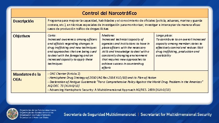 Control del Narcotráfico Descripción Programa para mejorar la capacidad, habilidades y el conocimiento de oficiales (policía, aduanas, marina y guarda costera, etc. ), en técnicas especiales de investigación para monitorizar, investigar e interceptar de manera eficaz casos de producción tráfico de drogas ilícitas Objetivos Corto: Increased awareness among officers and officials regarding changes in drug trafficking and new techniques and approaches that are being sued to deal with the foregoing and an increased capacity to apply these techniques Mandatos de la OEA: - OAS Charter (Article 2) - Hemisphere Drug Strategy of 2010 (AG Res 2556 XLO/10) and its Plan of Action - Declaration of Antigua Guatemala “For a Comprehensive Policy Against the World Drug Problem in the Americas” AG/DEC. 73 (XLIII-0/13) - Advancing Hemispheric Security: A Multidimensional Approach AG/RES. 2809 (XLIII-0/13) Mediano: Increased technical capacity of agencies and institutions to have in place officers with the necessary skills and knowledge to deal with a constantly changing environment that requires new approaches to achieve success in counterdrug efforts Largo plazo: To contribute to an overall increased capacity among member states to effectively control and reduce illicit drug trafficking, production and availability