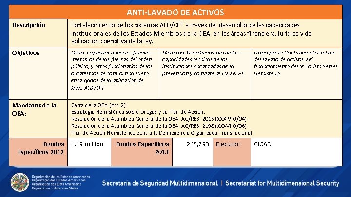 ANTI-LAVADO DE ACTIVOS Descripción Fortalecimiento de los sistemas ALD/CFT a través del desarrollo de las capacidades institucionales de los Estados Miembros de la OEA en las áreas financiera, jurídica y de aplicación coercitiva de la ley. Objetivos Corto: Capacitar a Jueces, fiscales, miembros de las fuerzas del orden público, y otros funcionarios de los organismos de control financiero encargados de la aplicación de leyes ALD/CFT. Mandatos de la OEA: Carta de la OEA (Art. 2) Estrategia Hemisférica sobre Drogas y su Plan de Acción. Resolución de la Asamblea General de la OEA: AG/RES. 2015 (XXXIV-O/04) Resolución de la Asamblea General de la OEA: AG/RES. 2198 (XXXVI-O/06) Plan de Acción Hemisférico contra la Delincuencia Organizada Transnacional Fondos Específicos 2012 1. 19 million Mediano: Fortalecimiento de las capacidades técnicas de los instituciones encargadas de la prevención y combate al LD y el FT. Fondos Específicos 2013 265, 793 Ejecutor: Largo plazo: Contribuir al combate del lavado de activos y el financiamiento del terrorismo en el Hemisferio. CICAD