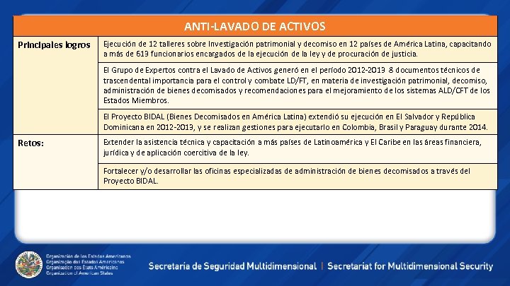 ANTI-LAVADO DE ACTIVOS Principales logros Ejecución de 12 talleres sobre Investigación patrimonial y decomiso en 12 países de América Latina, capacitando a más de 613 funcionarios encargados de la ejecución de la ley y de procuración de justicia. El Grupo de Expertos contra el Lavado de Activos generó en el período 2012 -2013 8 documentos técnicos de trascendental importancia para el control y combate LD/FT, en materia de investigación patrimonial, decomiso, administración de bienes decomisados y recomendaciones para el mejoramiento de los sistemas ALD/CFT de los Estados Miembros. El Proyecto BIDAL (Bienes Decomisados en América Latina) extendió su ejecución en El Salvador y República Dominicana en 2012 -2013, y se realizan gestiones para ejecutarlo en Colombia, Brasil y Paraguay durante 2014. Retos: Extender la asistencia técnica y capacitación a más países de Latinoamérica y El Caribe en las áreas financiera, jurídica y de aplicación coercitiva de la ley. Fortalecer y/o desarrollar las oficinas especializadas de administración de bienes decomisados a través del Proyecto BIDAL.