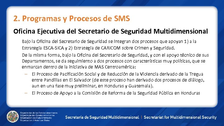 2. Programas y Procesos de SMS Oficina Ejecutiva del Secretario de Seguridad Multidimensional Bajo la Oficina del Secretario de Seguridad se integran dos procesos que apoyan 1) a la Estrategia ESCA-SICA y 2) Estrategia de CARICOM sobre Crimen y Seguridad. De la misma forma, bajo la Oficina del Secretario de Seguridad, y con el apoyo técnico de sus Departamentos, se da seguimiento a dos procesos con características muy políticas, que se enmarcan dentro de la iniciativa de MAS Centroamérica: – El Proceso de Pacificación Social y de Reducción de la Violencia derivado de la Tregua entre Pandillas en El Salvador (de este proceso han derivado dos procesos de diálogo, aun en una fase muy preliminar, en Honduras y Guatemala). – El Proceso de Apoyo a la Comisión de Reforma de la Seguridad Pública en Honduras