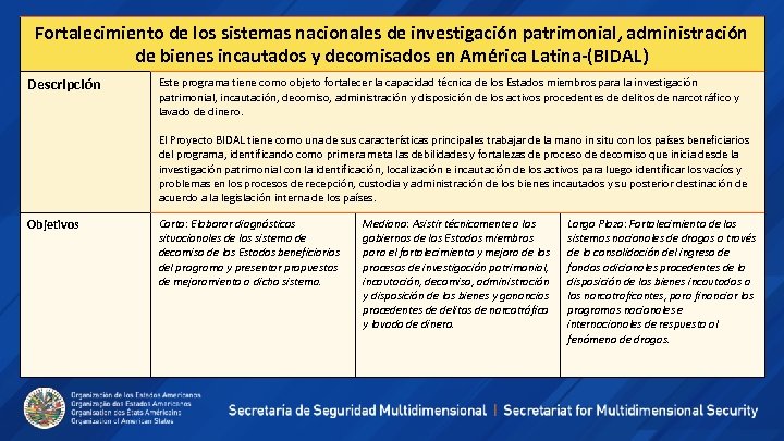 Fortalecimiento de los sistemas nacionales de investigación patrimonial, administración de bienes incautados y decomisados en América Latina-(BIDAL) Descripción Este programa tiene como objeto fortalecer la capacidad técnica de los Estados miembros para la investigación patrimonial, incautación, decomiso, administración y disposición de los activos procedentes de delitos de narcotráfico y lavado de dinero. El Proyecto BIDAL tiene como una de sus características principales trabajar de la mano in situ con los países beneficiarios del programa, identificando como primera meta las debilidades y fortalezas de proceso de decomiso que inicia desde la investigación patrimonial con la identificación, localización e incautación de los activos para luego identificar los vacíos y problemas en los procesos de recepción, custodia y administración de los bienes incautados y su posterior destinación de acuerdo a la legislación interna de los países. Objetivos Corto: Elaborar diagnósticos situacionales de los sistema de decomiso de los Estados beneficiarios del programa y presentar propuestas de mejoramiento a dicho sistema. Mediano: Asistir técnicamente a los gobiernos de los Estados miembros para el fortalecimiento y mejora de los procesos de investigación patrimonial, incautación, decomiso, administración y disposición de los bienes y ganancias procedentes de delitos de narcotráfico y lavado de dinero. Largo Plazo: Fortalecimiento de los sistemas nacionales de drogas a través de la consolidación del ingreso de fondos adicionales procedentes de la disposición de los bienes incautados a los narcotraficantes, para financiar los programas nacionales e internacionales de respuesta al fenómeno de drogas.