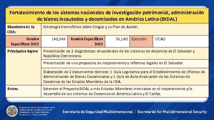 Fortalecimiento de los sistemas nacionales de investigación patrimonial, administración de bienes incautados y decomisados en América Latina-(BIDAL) Mandatos de la OEA: Fondos Específicos 2012 Principales logros Estrategia Hemisférica sobre Drogas y su Plan de Acción. 140, 349 Fondos Específicos 2013 56, 180 Ejecutor: CICAD Presentación de 2 diagnósticos situacionales de los sistemas de decomiso de El Salvador y República Dominicana. Presentación de una propuesta de mejoramiento y reformas legales en El Salvador. Elaboración de 2 documentos técnicos: 1 Guía Legislativa para el Establecimiento de Oficinas de Administración de Bienes Decomisados y 1 Guía de Auto-Evaluación de los Sistemas de Decomiso de los Estados Miembros de la OEA. Retos: Extender el Proyecto BIDAL a más Estados Miembros intersados en el mejoramiento y/o desarrollo de sus sistemas de Decomiso en América Latina y El Caribe.