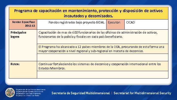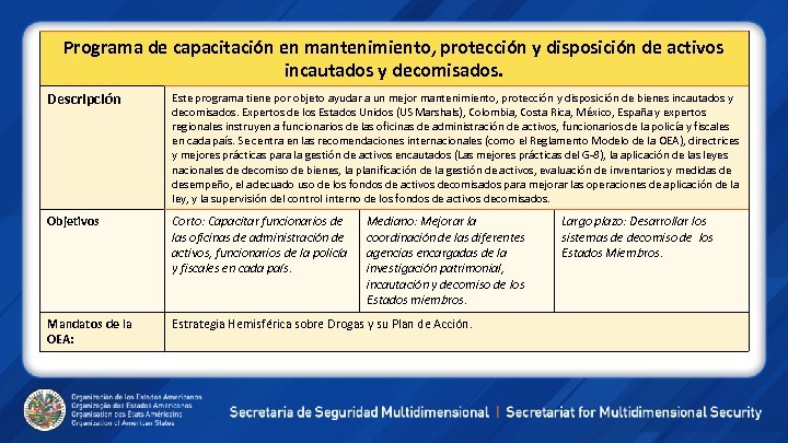 Programa de capacitación en mantenimiento, protección y disposición de activos incautados y decomisados. Descripción Este programa tiene por objeto ayudar a un mejor mantenimiento, protección y disposición de bienes incautados y decomisados. Expertos de los Estados Unidos (US Marshals), Colombia, Costa Rica, México, España y expertos regionales instruyen a funcionarios de las oficinas de administración de activos, funcionarios de la policía y fiscales en cada país. Se centra en las recomendaciones internacionales (como el Reglamento Modelo de la OEA), directrices y mejores prácticas para la gestión de activos encautados (Las mejores prácticas del G-8), la aplicación de las leyes nacionales de decomiso de bienes, la planificación de la gestión de activos, evaluación de inventarios y medidas de desempeño, el adecuado uso de los fondos de activos decomisados para mejorar las operaciones de aplicación de la ley, y la supervisión del control interno de los fondos de activos decomisados. Objetivos Corto: Capacitar funcionarios de las oficinas de administración de activos, funcionarios de la policía y fiscales en cada país. Mandatos de la OEA: Estrategia Hemisférica sobre Drogas y su Plan de Acción. Mediano: Mejorar la coordinación de las diferentes agencias encargadas de la investigación patrimonial, incautación y decomiso de los Estados miembros. Largo plazo: Desarrollar los sistemas de decomiso de los Estados Miembros.