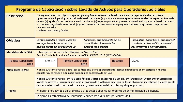 Programa de Capacitación sobre Lavado de Activos para Operadores Judiciales Descripción El Programa tiene como objetivo capacitar jueces y fiscales en temas de lavado de activos. La capacitación abarca los temas siguientes: (i) tipología y lógica delito de lavado de dinero; (ii) principios y marcos legales internacionales que regulan el lavado de dinero; (iii) legislación nacional sobre lavado de dinero; (iv) aspectos procesales y penales vinculados a los juicios de lavado de dinero; (v) cooperación judicial internacional; (vii) Financiamiento del Terrorismo. Este programa contiene los siguientes componentes: - Juicios Simulados - Talleres para jueces y fiscales Objetivos Corto: Capacitar a jueces y fiscales encargados de la persecución y enjuiciamiento de los delitos de LD. Mandatos de la OEA: Estrategia Hemisférica sobre Drogas y su Plan de Acción. Resolución de la Asamblea General de la OEA: AG/RES. 2015 (XXXIV-O/04) Fondos Específicos 2012 Principales logros 549, 474 Mediano: Fortalecimiento de las capacidades técnicas de los operadores judiciales. Fondos Específicos 2013 - Ejecutor: Largo plazo: Contribuir al combate del lavado de activos y el financiamiento del terrorismo en el Hemisferio. CICAD Más de 300 funcionarios, entre jueces, fiscales y otros operadores de justicia, entrenados en investigación, técnica acusatoria y conducción de juicio para delitos de lavado de activos. Más de 300 funcionarios, entre jueces, fiscales y otros operadores de justicia, entrenados en fundamentos teóricos del lavado de activos y jurisprudencia, para el examen de problemas prácticos en torno al análisis, investigación y juzgamiento de casos relacionados con lavado de activos, financiamiento del terrorismo y drogas, por país. Retos: Mejorar la efectividad en el ámbito de las actuaciones de los órganos de administración de justicia. Mejorar las estadísticas de sentencias condenatorias firmes por delitos de LD.
