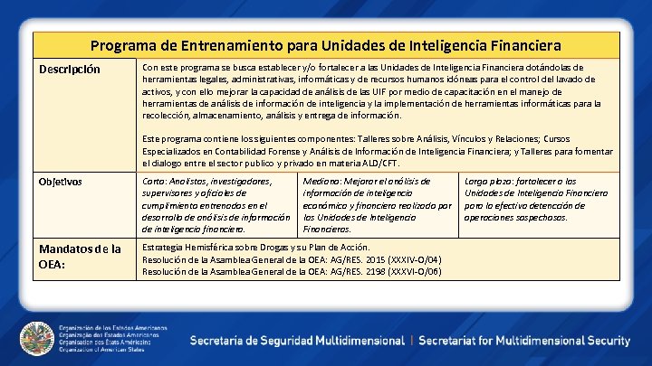 Programa de Entrenamiento para Unidades de Inteligencia Financiera Descripción Con este programa se busca establecer y/o fortalecer a las Unidades de Inteligencia Financiera dotándolas de herramientas legales, administrativas, informáticas y de recursos humanos idóneas para el control del lavado de activos, y con ello mejorar la capacidad de análisis de las UIF por medio de capacitación en el manejo de herramientas de análisis de información de inteligencia y la implementación de herramientas informáticas para la recolección, almacenamiento, análisis y entrega de información. Este programa contiene los siguientes componentes: Talleres sobre Análisis, Vínculos y Relaciones; Cursos Especializados en Contabilidad Forense y Análisis de Información de Inteligencia Financiera; y Talleres para fomentar el dialogo entre el sector publico y privado en materia ALD/CFT. Objetivos Corto: Analistas, investigadores, supervisores y oficiales de cumplimiento entrenados en el desarrollo de análisis de información de inteligencia financiera. Mandatos de la OEA: Estrategia Hemisférica sobre Drogas y su Plan de Acción. Resolución de la Asamblea General de la OEA: AG/RES. 2015 (XXXIV-O/04) Resolución de la Asamblea General de la OEA: AG/RES. 2198 (XXXVI-O/06) Mediano: Mejorar el análisis de información de inteligencia económica y financiera realizado por las Unidades de Inteligencia Financieras. Largo plazo: fortalecer a las Unidades de Inteligencia Financiera para la efectiva detencción de operaciones sospechosas.