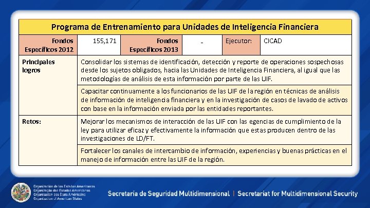 Programa de Entrenamiento para Unidades de Inteligencia Financiera Fondos Específicos 2012 Principales logros 155, 171 Fondos Específicos 2013 - Ejecutor: CICAD Consolidar los sistemas de identificación, detección y reporte de operaciones sospechosas desde los sujetos obligados, hacia las Unidades de Inteligencia Financiera, al igual que las metodologías de análisis de esta información por parte de las UIF. Capacitar continuamente a los funcionarios de las UIF de la región en técnicas de análisis de información de inteligencia financiera y en la investigación de casos de lavado de activos con base en la información enviada por las entidades reportantes. Retos: Mejorar los mecanismos de interacción de las UIF con las egencias de cumplimiento de la ley para utilizar eficaz y efectivamente la información que estas producen dentro de las investigaciones de LD/FT. Fortalecer los canales de intercambio de información, experiencias y buenas prácticas en el manejo de información entre las UIF de la región.