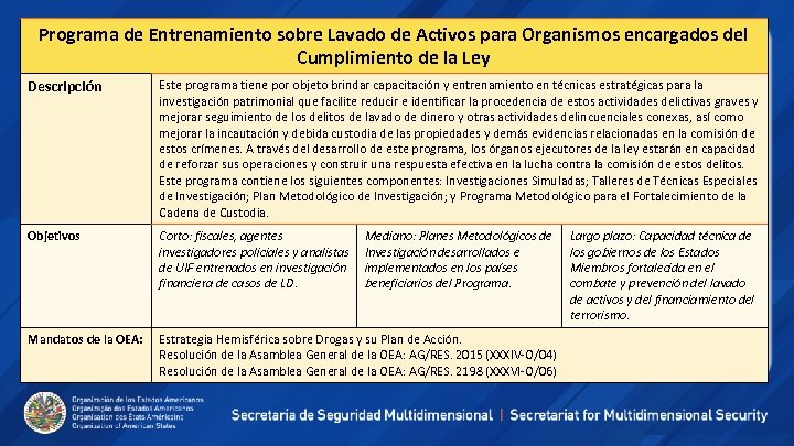Programa de Entrenamiento sobre Lavado de Activos para Organismos encargados del Cumplimiento de la Ley Descripción Este programa tiene por objeto brindar capacitación y entrenamiento en técnicas estratégicas para la investigación patrimonial que facilite reducir e identificar la procedencia de estos actividades delictivas graves y mejorar seguimiento de los delitos de lavado de dinero y otras actividades delincuenciales conexas, así como mejorar la incautación y debida custodia de las propiedades y demás evidencias relacionadas en la comisión de estos crímenes. A través del desarrollo de este programa, los órganos ejecutores de la ley estarán en capacidad de reforzar sus operaciones y construir una respuesta efectiva en la lucha contra la comisión de estos delitos. Este programa contiene los siguientes componentes: Investigaciones Simuladas; Talleres de Técnicas Especiales de Investigación; Plan Metodológico de Investigación; y Programa Metodológico para el Fortalecimiento de la Cadena de Custodia. Objetivos Corto: fiscales, agentes investigadores policiales y analistas de UIF entrenados en investigación financiera de casos de LD. Mandatos de la OEA: Estrategia Hemisférica sobre Drogas y su Plan de Acción. Resolución de la Asamblea General de la OEA: AG/RES. 2015 (XXXIV-O/04) Resolución de la Asamblea General de la OEA: AG/RES. 2198 (XXXVI-O/06) Mediano: Planes Metodológicos de Investigación desarrollados e implementados en los países beneficiarios del Programa. Largo plazo: Capacidad técnica de los gobiernos de los Estados Miembros fortalecida en el combate y prevención del lavado de activos y del financiamiento del terrorismo.