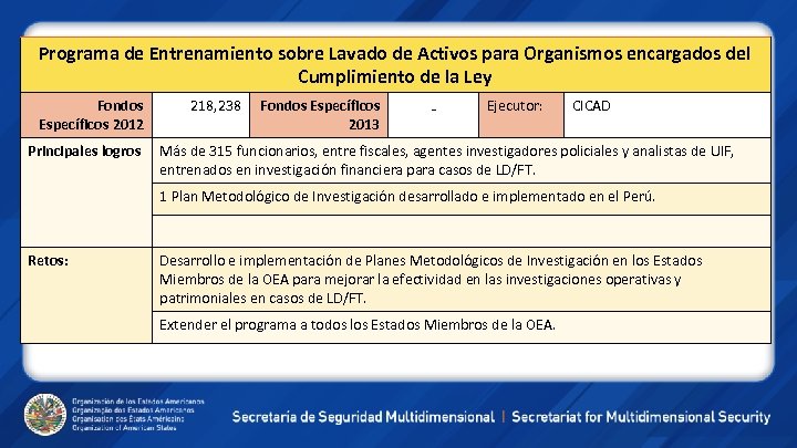 Programa de Entrenamiento sobre Lavado de Activos para Organismos encargados del Cumplimiento de la Ley Fondos Específicos 2012 Principales logros 218, 238 Fondos Específicos 2013 - Ejecutor: CICAD Más de 315 funcionarios, entre fiscales, agentes investigadores policiales y analistas de UIF, entrenados en investigación financiera para casos de LD/FT. 1 Plan Metodológico de Investigación desarrollado e implementado en el Perú. Retos: Desarrollo e implementación de Planes Metodológicos de Investigación en los Estados Miembros de la OEA para mejorar la efectividad en las investigaciones operativas y patrimoniales en casos de LD/FT. Extender el programa a todos los Estados Miembros de la OEA.