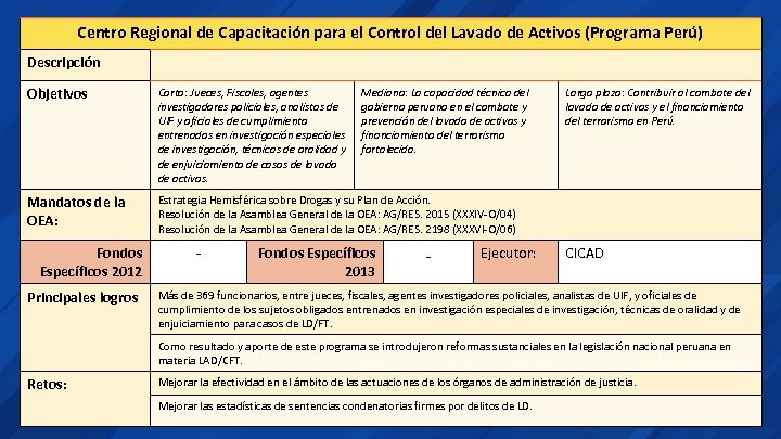 Centro Regional de Capacitación para el Control del Lavado de Activos (Programa Perú) Descripción Objetivos Corto: Jueces, Fiscales, agentes investigadores policiales, analistas de UIF y oficiales de cumplimiento entrenados en investigación especiales de investigación, técnicas de oralidad y de enjuiciamiento de casos de lavado de activos. Mandatos de la OEA: Estrategia Hemisférica sobre Drogas y su Plan de Acción. Resolución de la Asamblea General de la OEA: AG/RES. 2015 (XXXIV-O/04) Resolución de la Asamblea General de la OEA: AG/RES. 2198 (XXXVI-O/06) Fondos Específicos 2012 Principales logros - Mediano: La capacidad técnica del gobierno peruano en el combate y prevención del lavado de activos y financiamiento del terrorismo fortalecida. Fondos Específicos 2013 - Ejecutor: Largo plazo: Contribuir al combate del lavado de activos y el financiamiento del terrorismo en Perú. CICAD Más de 369 funcionarios, entre jueces, fiscales, agentes investigadores policiales, analistas de UIF, y oficiales de cumplimiento de los sujetos obligados entrenados en investigación especiales de investigación, técnicas de oralidad y de enjuiciamiento para casos de LD/FT. Como resultado y aporte de este programa se introdujeron reformas sustanciales en la legislación nacional peruana en materia LAD/CFT. Retos: Mejorar la efectividad en el ámbito de las actuaciones de los órganos de administración de justicia. Mejorar las estadísticas de sentencias condenatorias firmes por delitos de LD.