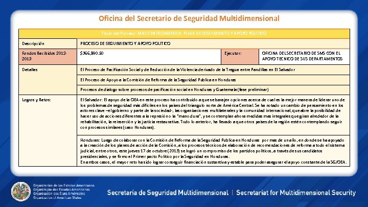 Oficina del Secretario de Seguridad Multidimensional Título del Proceso: MAS CENTROAMERICA: PILAR DE SEGUIMIENTO Y APOYO POLITICO Descripción PROCESO DE SEGUIMIENTO Y APOYO POLITICO Fondos Recibidos 20122013 $366, 890. 50 Detalles El Proceso de Pacificación Social y de Reducción de la Violencia derivado de la Tregua entre Pandillas en El Salvador Ejecutor: OFICINA DEL SECRETARIO DE SMS CON EL APOYO TECNICO DE SUS DEPARTAMENTOS El Proceso de Apoyo a la Comisión de Reforma de la Seguridad Publica en Honduras Procesos de dialogo sobre procesos de pacificación social en Honduras y Guatemala (fase preliminar) Logros y Retos: El Salvador: El apoyo de la OEA en este proceso ha contribuido a que se barajen opciones acerca de cual es la mejor manera de liderar uno de los problemas de seguridad más difíciles en los países del triangulo norte de América Central. Se ha notado un cambio de pensamiento en los actores clave –el gobierno y parte de la sociedad-, las organizaciones multilaterales y la comunidad internacional, que abre la posibilidad de hacer uso de acciones diferentes a la represión o la “mano dura”, y se contemplan ahora medidas mas integrales que giran alrededor de la rehabilitación, la reinserción y la justicia restaurativa. Todo lo anterior, ha llevado a que otros países de la región estén contemplando seguir con procesos similares (caso Honduras). Honduras: Luego de colaborar con la Comisión de Reforma de la Seguridad Publica en Honduras por mas de un año, en donde se ha apoyado a la creación de los planes de acción de la Comisión, a los procesos técnicos de elaboración de recomendaciones de reforma a todo el sistema judicial, entre otros, este jueves 17 de octubre (2013) se logró un compromiso de los partidos políticos, a través de sus candidatos presidenciales, y se firmo el Primer pacto Político por la Seguridad en Honduras. En ambos casos, el mayor reto ha sido lograr conseguir financiación sustantiva y estable para poder asegurar el apoyo constante de la SG/OEA.