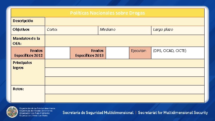 Políticas Nacionales sobre Drogas Descripción Objetivos Corto: Mediano Largo plazo Mandatos de la OEA: Fondos Específicos 2012 Principales logros Retos: Fondos Específicos 2013 Ejecutor: (DPS, CICAD, CICTE)