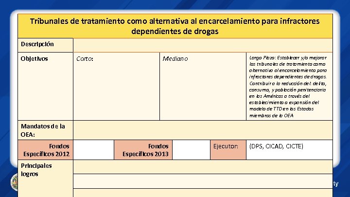Tribunales de tratamiento como alternativa al encarcelamiento para infractores dependientes de drogas Descripción Objetivos Corto: Mediano Largo Plazo: Establecer y/o mejorar los tribunales de tratamiento como alternativa al encarcelamiento para infractores dependientes de drogas. Contribuir a la reducción del: delito, consumo, y población penitenciaria en las Américas a través del establecimiento o expansión del modelo de TTD en los Estados miembros de la OEA Mandatos de la OEA: Fondos Específicos 2012 Principales logros Fondos Específicos 2013 Ejecutor: (DPS, CICAD, CICTE)