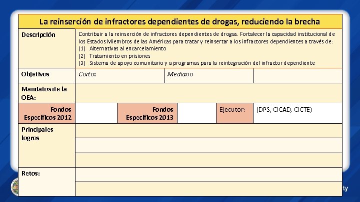 La reinserción de infractores dependientes de drogas, reduciendo la brecha Descripción Contribuir a la reinserción de infractores dependientes de drogas. Fortalecer la capacidad institucional de los Estados Miembros de las Américas para tratar y reinsertar a los infractores dependientes a través de: (1) Alternativas al encarcelamiento (2) Tratamiento en prisiones (3) Sistema de apoyo comunitario y a programas para la reintegración del infractor dependiente Objetivos Corto: Mediano Mandatos de la OEA: Fondos Específicos 2012 Principales logros Retos: Fondos Específicos 2013 Ejecutor: (DPS, CICAD, CICTE)