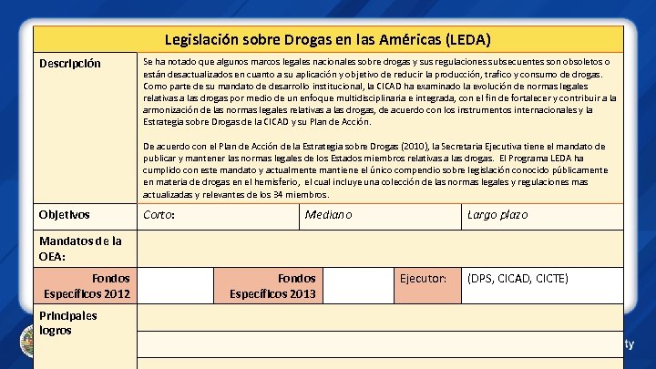 Legislación sobre Drogas en las Américas (LEDA) Descripción Se ha notado que algunos marcos legales nacionales sobre drogas y sus regulaciones subsecuentes son obsoletos o están desactualizados en cuanto a su aplicación y objetivo de reducir la producción, trafico y consumo de drogas. Como parte de su mandato de desarrollo institucional, la CICAD ha examinado la evolución de normas legales relativas a las drogas por medio de un enfoque multidisciplinaria e integrada, con el fin de fortalecer y contribuir a la armonización de las normas legales relativas a las drogas, de acuerdo con los instrumentos internacionales y la Estrategia sobre Drogas de la CICAD y su Plan de Acción. De acuerdo con el Plan de Acción de la Estrategia sobre Drogas (2010), la Secretaria Ejecutiva tiene el mandato de publicar y mantener las normas legales de los Estados miembros relativas a las drogas. El Programa LEDA ha cumplido con este mandato y actualmente mantiene el único compendio sobre legislación conocido públicamente en materia de drogas en el hemisferio, el cual incluye una colección de las normas legales y regulaciones mas actualizadas y relevantes de los 34 miembros. Objetivos Corto: Mediano Largo plazo Mandatos de la OEA: Fondos Específicos 2012 Principales logros Fondos Específicos 2013 Ejecutor: (DPS, CICAD, CICTE)