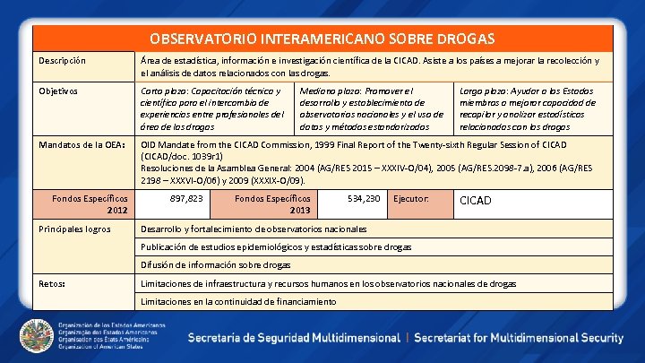OBSERVATORIO INTERAMERICANO SOBRE DROGAS Descripción Área de estadística, información e investigación científica de la CICAD. Asiste a los países a mejorar la recolección y el análisis de datos relacionados con las drogas. Objetivos Corto plazo: Capacitación técnica y científica para el intercambio de experiencias entre profesionales del área de las drogas Mandatos de la OEA: OID Mandate from the CICAD Commission, 1999 Final Report of the Twenty-sixth Regular Session of CICAD (CICAD/doc. 1039 r 1) Resoluciones de la Asamblea General: 2004 (AG/RES 2015 – XXXIV-O/04), 2005 (AG/RES. 2098 -7. a), 2006 (AG/RES 2198 – XXXVI-O/06) y 2009 (XXXIX-O/09). Fondos Específicos 2012 Principales logros 897, 823 Mediano plazo: Promover el desarrollo y establecimiento de observatorios nacionales y el uso de datos y métodos estandarizados Fondos Específicos 2013 534, 230 Ejecutor: Largo plazo: Ayudar a los Estados miembros a mejorar capacidad de recopilar y analizar estadísticas relacionadas con las drogas CICAD Desarrollo y fortalecimiento de observatorios nacionales Publicación de estudios epidemiológicos y estadísticas sobre drogas Difusión de información sobre drogas Retos: Limitaciones de infraestructura y recursos humanos en los observatorios nacionales de drogas Limitaciones en la continuidad de financiamiento