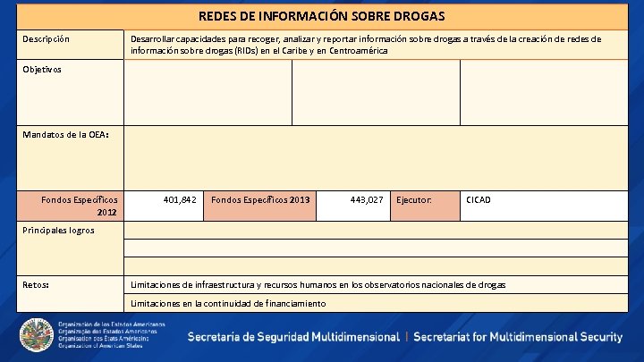 REDES DE INFORMACIÓN SOBRE DROGAS Descripción Desarrollar capacidades para recoger, analizar y reportar información sobre drogas a través de la creación de redes de información sobre drogas (RIDs) en el Caribe y en Centroamérica Objetivos Mandatos de la OEA: Fondos Específicos 2012 401, 842 Fondos Específicos 2013 443, 027 Ejecutor: CICAD Principales logros Retos: Limitaciones de infraestructura y recursos humanos en los observatorios nacionales de drogas Limitaciones en la continuidad de financiamiento