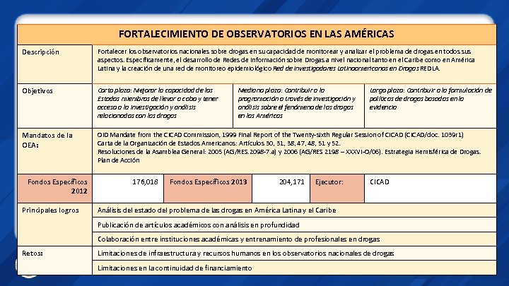 FORTALECIMIENTO DE OBSERVATORIOS EN LAS AMÉRICAS Descripción Fortalecer los observatorios nacionales sobre drogas en su capacidad de monitorear y analizar el problema de drogas en todos sus aspectos. Específicamente, el desarrollo de Redes de Información sobre Drogas a nivel nacional tanto en el Caribe como en América Latina y la creación de una red de monitoreo epidemiológico Red de Investigadores Latinoamericanos en Drogas REDLA. Objetivos Corto plazo: Mejorar la capacidad de los Estados miembros de llevar a cabo y tener acceso a la investigación y análisis relacionados con las drogas Mandatos de la OEA: OID Mandate from the CICAD Commission, 1999 Final Report of the Twenty-sixth Regular Session of CICAD (CICAD/doc. 1039 r 1) Carta de la Organización de Estados Americanos: Artículos 30, 31, 38, 47, 48, 51 y 52. Resoluciones de la Asamblea General: 2005 (AG/RES. 2098 -7. a) y 2006 (AG/RES 2198 – XXXVI-O/06). Estrategia Hemisférica de Drogas. Plan de Acción Fondos Específicos 2012 Principales logros 176, 018 Mediano plazo: Contribuir a la programación a través de investigación y análisis sobre el fenómeno de las drogas en las Américas Fondos Específicos 2013 204, 171 Ejecutor: Largo plazo: Contribuir a la formulación de políticas de drogas basadas en la evidencia CICAD Análisis del estado del problema de las drogas en América Latina y el Caribe Publicación de artículos académicos con análisis en profundidad Colaboración entre instituciones académicas y entrenamiento de profesionales en drogas Retos: Limitaciones de infraestructura y recursos humanos en los observatorios nacionales de drogas Limitaciones en la continuidad de financiamiento