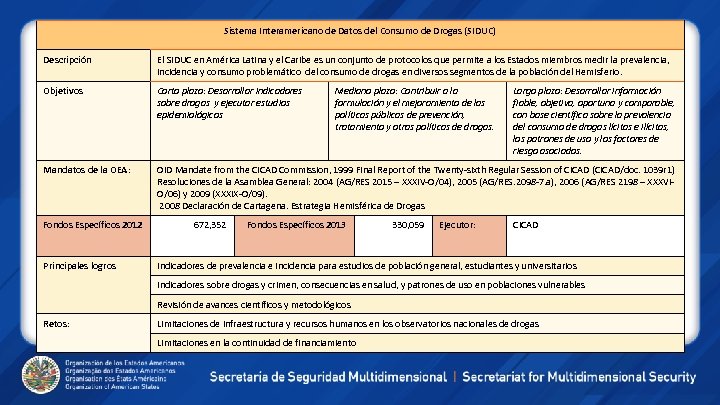 Sistema Interamericano de Datos del Consumo de Drogas (SIDUC) Descripción El SIDUC en América Latina y el Caribe es un conjunto de protocolos que permite a los Estados miembros medir la prevalencia, incidencia y consumo problemático del consumo de drogas en diversos segmentos de la población del Hemisferio. Objetivos Corto plazo: Desarrollar indicadores sobre drogas y ejecutar estudios epidemiológicos Mandatos de la OEA: OID Mandate from the CICAD Commission, 1999 Final Report of the Twenty-sixth Regular Session of CICAD (CICAD/doc. 1039 r 1) Resoluciones de la Asamblea General: 2004 (AG/RES 2015 – XXXIV-O/04), 2005 (AG/RES. 2098 -7. a), 2006 (AG/RES 2198 – XXXVIO/06) y 2009 (XXXIX-O/09). 2008 Declaración de Cartagena. Estrategia Hemisférica de Drogas Fondos Específicos 2012 Principales logros 672, 352 Mediano plazo: Contribuir a la formulación y el mejoramiento de las políticas públicas de prevención, tratamiento y otras políticas de drogas. Fondos Específicos 2013 330, 059 Ejecutor: Largo plazo: Desarrollar información fiable, objetiva, oportuna y comparable, con base científica sobre la prevalencia del consumo de drogas lícitas e ilícitas, los patrones de uso y los factores de riesgo asociados. CICAD Indicadores de prevalencia e incidencia para estudios de población general, estudiantes y universitarios Indicadores sobre drogas y crimen, consecuencias en salud, y patrones de uso en poblaciones vulnerables Revisión de avances científicos y metodológicos Retos: Limitaciones de infraestructura y recursos humanos en los observatorios nacionales de drogas Limitaciones en la continuidad de financiamiento