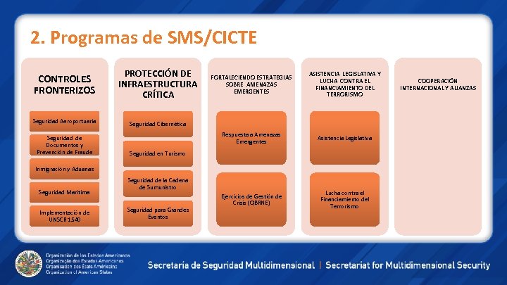 2. Programas de SMS/CICTE CONTROLES FRONTERIZOS PROTECCIÓN DE INFRAESTRUCTURA CRÍTICA Seguridad Aeroportuaria Seguridad Cibernética Seguridad de Documentos y Prevención de Fraude FORTALECIENDO ESTRATEGIAS SOBRE AMENAZAS EMERGENTES ASISTENCIA LEGISLATIVA Y LUCHA CONTRA EL FINANCIAMIENTO DEL TERRORISMO Respuesta a Amenazas Emergentes Asistencia Legislativa Ejercicios de Gestión de Crisis (QBRNE) Lucha contra el Financiamiento del Terrorismo Seguridad en Turismo Inmigración y Aduanas Seguridad Marítima Implementación de UNSCR 1540 Seguridad de la Cadena de Sumunistro Seguridad para Grandes Eventos COOPERACIÓN INTERNACIONAL Y ALIANZAS