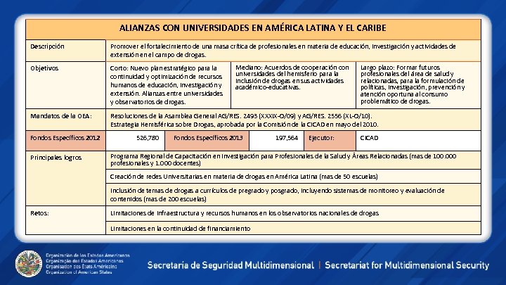 ALIANZAS CON UNIVERSIDADES EN AMÉRICA LATINA Y EL CARIBE Descripción Promover el fortalecimiento de una masa crítica de profesionales en materia de educación, investigación y actividades de extensión en el campo de drogas. Objetivos Corto: Nuevo plan estratégico para la continuidad y optimización de recursos humanos de educación, investigación y extensión. Alianzas entre universidades y observatorios de drogas. Mandatos de la OEA: Resoluciones de la Asamblea General AG/RES. 2493 (XXXIX-O/09) y AG/RES. 2556 (XL-O/10). Estrategia Hemisférica sobre Drogas, aprobada por la Comisión de la CICAD en mayo del 2010. Fondos Específicos 2012 Principales logros 526, 780 Mediano: Acuerdos de cooperación con universidades del hemisferio para la inclusión de drogas en sus actividades académico-educativas. Fondos Específicos 2013 197, 564 Ejecutor: Largo plazo: Formar futuros profesionales del área de salud y relacionadas, para la formulación de políticas, investigación, prevención y atención oportuna al consumo problemático de drogas. CICAD Programa Regional de Capacitación en Investigación para Profesionales de la Salud y Áreas Relacionadas (mas de 100. 000 profesionales y 1. 000 docentes) Creación de redes Universitarias en materia de drogas en América Latina (mas de 50 escuelas) Inclusión de temas de drogas a currículos de pregrado y posgrado, incluyendo sistemas de monitoreo y evaluación de contenidos (mas de 200 escuelas) Retos: Limitaciones de infraestructura y recursos humanos en los observatorios nacionales de drogas Limitaciones en la continuidad de financiamiento