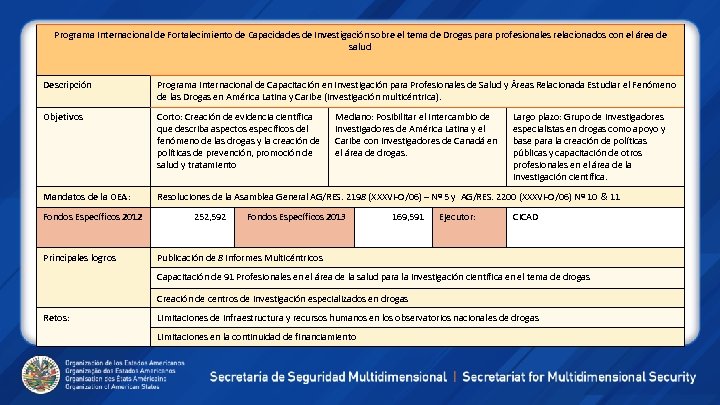 Programa Internacional de Fortalecimiento de Capacidades de Investigación sobre el tema de Drogas para profesionales relacionados con el área de salud Descripción Programa Internacional de Capacitación en Investigación para Profesionales de Salud y Áreas Relacionada Estudiar el Fenómeno de las Drogas en América Latina y Caribe (investigación multicéntrica). Objetivos Corto: Creación de evidencia científica que describa aspectos específicos del fenómeno de las drogas y la creación de políticas de prevención, promoción de salud y tratamiento Mandatos de la OEA: Resoluciones de la Asamblea General AG/RES. 2198 (XXXVI-O/06) – Nº 5 y AG/RES. 2200 (XXXVI-O/06) Nº 10 & 11 Fondos Específicos 2012 Principales logros 252, 592 Mediano: Posibilitar el intercambio de investigadores de América Latina y el Caribe con Investigadores de Canadá en el área de drogas. Fondos Específicos 2013 169, 591 Ejecutor: Largo plazo: Grupo de investigadores especialistas en drogas como apoyo y base para la creación de políticas públicas y capacitación de otros profesionales en el área de la investigación científica. CICAD Publicación de 8 Informes Multicéntricos Capacitación de 91 Profesionales en el área de la salud para la investigación científica en el tema de drogas Creación de centros de investigación especializados en drogas Retos: Limitaciones de infraestructura y recursos humanos en los observatorios nacionales de drogas Limitaciones en la continuidad de financiamiento