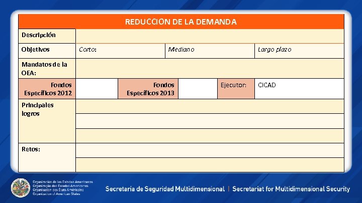 REDUCCION DE LA DEMANDA Descripción Objetivos Corto: Mediano Largo plazo Mandatos de la OEA: Fondos Específicos 2012 Principales logros Retos: Fondos Específicos 2013 Ejecutor: CICAD