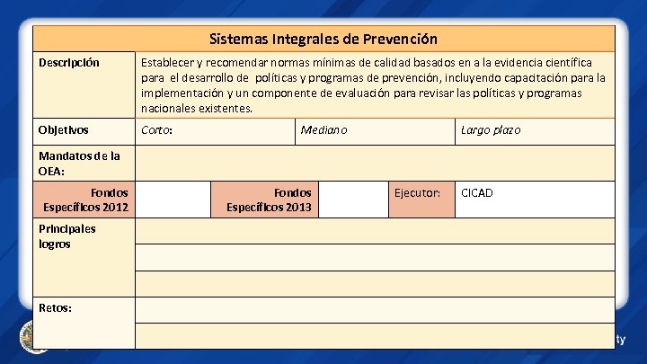 Sistemas Integrales de Prevención Descripción Establecer y recomendar normas mínimas de calidad basados en a la evidencia científica para el desarrollo de políticas y programas de prevención, incluyendo capacitación para la implementación y un componente de evaluación para revisar las políticas y programas nacionales existentes. Objetivos Corto: Mediano Largo plazo Mandatos de la OEA: Fondos Específicos 2012 Principales logros Retos: Fondos Específicos 2013 Ejecutor: CICAD