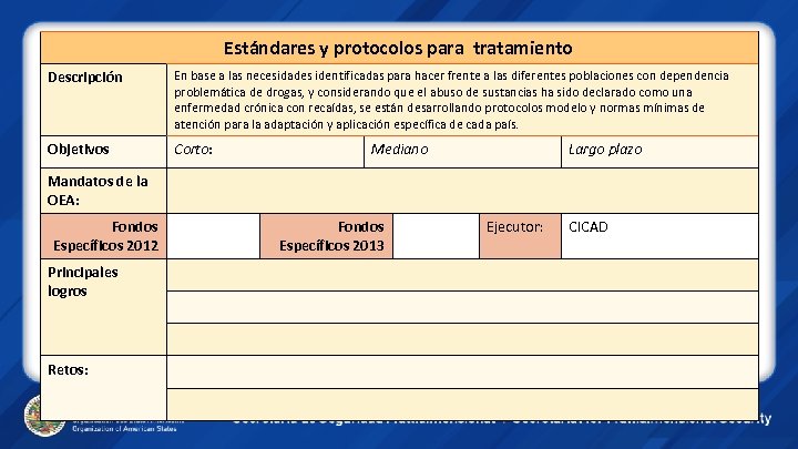 Estándares y protocolos para tratamiento Descripción En base a las necesidades identificadas para hacer frente a las diferentes poblaciones con dependencia problemática de drogas, y considerando que el abuso de sustancias ha sido declarado como una enfermedad crónica con recaídas, se están desarrollando protocolos modelo y normas mínimas de atención para la adaptación y aplicación específica de cada país. Objetivos Corto: Mediano Largo plazo Mandatos de la OEA: Fondos Específicos 2012 Principales logros Retos: Fondos Específicos 2013 Ejecutor: CICAD