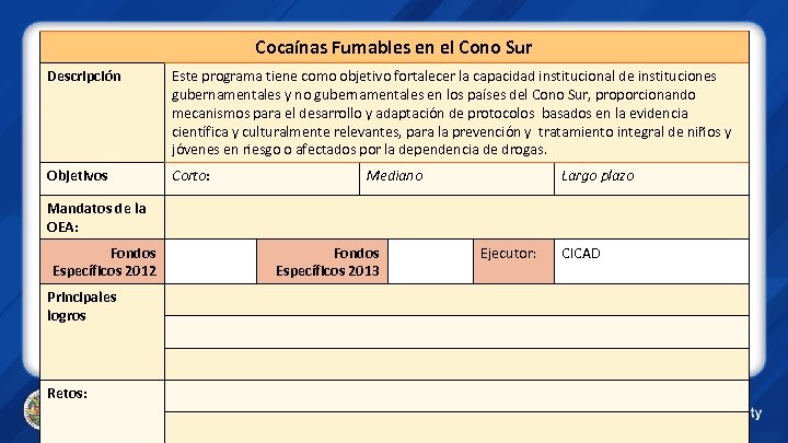 Cocaínas Fumables en el Cono Sur Descripción Este programa tiene como objetivo fortalecer la capacidad institucional de instituciones gubernamentales y no gubernamentales en los países del Cono Sur, proporcionando mecanismos para el desarrollo y adaptación de protocolos basados en la evidencia científica y culturalmente relevantes, para la prevención y tratamiento integral de niños y jóvenes en riesgo o afectados por la dependencia de drogas. Objetivos Corto: Mediano Largo plazo Mandatos de la OEA: Fondos Específicos 2012 Principales logros Retos: Fondos Específicos 2013 Ejecutor: CICAD
