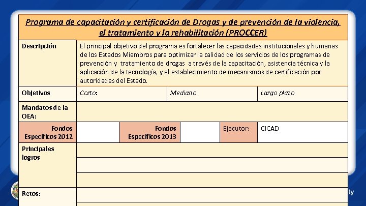 Programa de capacitación y certificación de Drogas y de prevención de la violencia, el tratamiento y la rehabilitación (PROCCER) Descripción El principal objetivo del programa es fortalecer las capacidades institucionales y humanas de los Estados Miembros para optimizar la calidad de los servicios de los programas de prevención y tratamiento de drogas a través de la capacitación, asistencia técnica y la aplicación de la tecnología, y el establecimiento de mecanismos de certificación por autoridades del Estado. Objetivos Corto: Mediano Largo plazo Mandatos de la OEA: Fondos Específicos 2012 Principales logros Retos: Fondos Específicos 2013 Ejecutor: CICAD