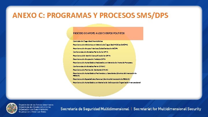 ANEXO C: PROGRAMAS Y PROCESOS SMS/DPS PROCESO DE APOYO A LOS CUERPOS POLITICOS Comisión de Seguridad Hemisférica Reuniones de Ministros en Materia de Seguridad Pública (MISPA) Reuniones de Grupos Técnicos Subsidiarios de MISPA Conferencias de Estados Parte de la CIFTA Reuniones del Comité Consultivo de la CIFTA Reuniones de Grupos de Trabajo CIFTA Reuniones de Autoridades Nacionales en Materia de Trata de Personas Conferencias de Estados Parte CITAAC Reuniones de Puntos de Contacto CITAAC Reuniones de Autoridades Penitencias y Carcelarias (dentro del marco de la REMJA) Reuniones de Especialistas Forense (dentro del marco de la REMJA) Reuniones de Autoridades en Materia de Delincuencia Organizada Transnacional