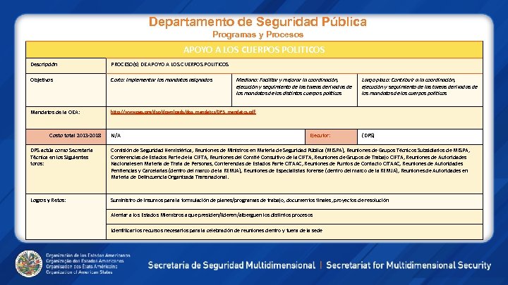 Departamento de Seguridad Pública Programas y Procesos APOYO A LOS CUERPOS POLITICOS Descripción PROCESO(s) DE APOYO A LOS CUERPOS POLITICOS Objetivos Corto: Implementar los mandatos asignados Mandatos de la OEA: http: //www. oas. org/dsp/downloads/dps_mandates/DPS_mandates. pdf Costo total 2013 -2018 N/A Mediano: Facilitar y mejorar la coordinación, ejecución y seguimiento de las tareas derivadas de los mandatos de los distintos cuerpos políticos Ejecutor: Largo plazo: Contribuir a la coordinación, ejecución y seguimiento de las tareas derivadas de los mandatos de los cuerpos políticos (DPS) DPS actúa como Secretaria Técnica en los Siguientes foros: Comisión de Seguridad Hemisférica, Reuniones de Ministros en Materia de Seguridad Pública (MISPA), Reuniones de Grupos Técnicos Subsidiarios de MISPA, Conferencias de Estados Parte de la CIFTA, Reuniones del Comité Consultivo de la CIFTA, Reuniones de Grupos de Trabajo CIFTA, Reuniones de Autoridades Nacionales en Materia de Trata de Personas, Conferencias de Estados Parte CITAAC, Reuniones de Puntos de Contacto CITAAC, Reuniones de Autoridades Penitencias y Carcelarias (dentro del marco de la REMJA), Reuniones de Especialistas Forense (dentro del marco de la REMJA), Reuniones de Autoridades en Materia de Delincuencia Organizada Transnacional. Logros y Retos: Suministro de insumos para la formulación de planes/programas de trabajo, documentos finales, proyectos de resolución Alentar a los Estados Miembros a que presiden/lideren/alberguen los distintos procesos Identificar los recursos necesarios para la celebración de reuniones dentro y fuera de la sede