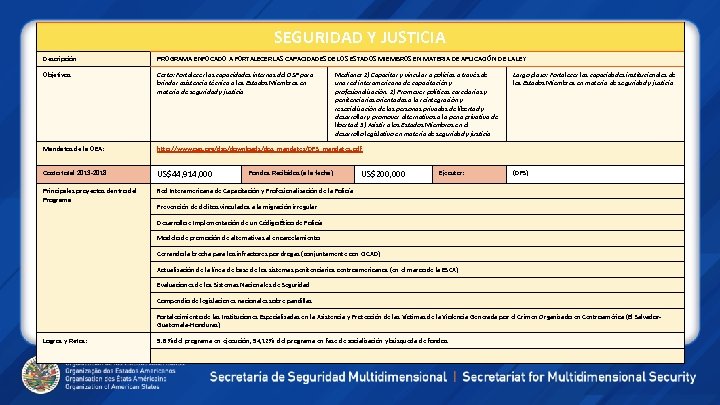 SEGURIDAD Y JUSTICIA Descripción PROGRAMA ENFOCADO A FORTALECER LAS CAPACIDADES DE LOS ESTADOS MIEMBROS EN MATERIA DE APLICACIÓN DE LA LEY Objetivos Corto: Fortalecer las capacidades internas del DSP para brindar asistencia técnica a los Estados Miembros en materia de seguridad y justicia Mandatos de la OEA: http: //www. oas. org/dsp/downloads/dps_mandates/DPS_mandates. pdf Costo total 2013 -2018 US$44, 914, 000 Principales proyectos dentro del Programa Red Interamericana de Capacitación y Profesionalización de la Policía Mediano: 1) Capacitar y vincular a policías a través de una red interamericana de capacitación y profesionalización. 2) Promover políticas carcelarias y penitenciarias orientadas a la reintegración y resocialización de las personas privadas de libertad y desarrollar y promover alternativos a la pena privativa de libertad. 3) Asistir a los Estados Miembros en el desarrollo legislativo en materia de seguridad y justicia Fondos Recibidos (a la fecha) US$200, 000 Ejecutor: Largo plazo: Fortalecer las capacidades institucionales de los Estados Miembros en materia de seguridad y justicia (DPS) Prevención de delitos vinculados a la migración irregular Desarrollo e Implementación de un Código Ético de Policía Modelo de promoción de alternativas al encarcelamiento Cerrando la brecha para los infractores por drogas (conjuntamente con CICAD) Actualización de la línea de base de los sistemas penitenciarios centroamericanos (en el marco de la ESCA) Evaluaciones de los Sistemas Nacionales de Seguridad Compendio de legislaciones nacionales sobre pandillas Fortalecimiento de las Instituciones Especializadas en la Asistencia y Protección de las Víctimas de la Violencia Generada por el Crimen Organizado en Centroamérica (El Salvador. Guatemala-Honduras) Logros y Retos: 5. 8 % del programa en ejecución, 94, 12% del programa en fase de socialización y búsqueda de fondos