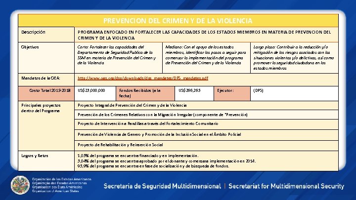 PREVENCION DEL CRIMEN Y DE LA VIOLENCIA Descripción PROGRAMA ENFOCADO EN FORTALECER LAS CAPACIDADES DE LOS ESTADOS MIEMBROS EN MATERIA DE PREVENCION DEL CRIMEN Y DE LA VIOLENCIA Objetivos Corto: Fortalecer las capacidades del Departamento de Seguridad Publica de la SSM en materia de Prevención del Crimen y de la Violencia Mandatos de la OEA: http: //www. oas. org/dsp/downloads/dps_mandates/DPS_mandates. pdf Costo Total 2013 -2018 Principales proyectos dentro del Programa US$23, 000 Fondos Recibidos (a la fecha) Mediano: Con el apoyo de los estados miembros, identificar los pasos a seguir para comenzar la implementación del programa de Prevención del Crimen y de la Violencia US$266, 265 Ejecutor: Largo plazo: Contribuir a la reducción y/o mitigación de los riesgos asociados con las situaciones violentas y/o delictivas, así como promover la seguridad ciudadana en los estados miembros (DPS) Proyecto Integral de Prevención del Crimen y de la Violencia Prevención de los Crímenes Relativos con la Migración Irregular (componente de “Prevención) Proyecto de Intervención a Pandillas a través del Fortalecimiento Comunitario Prevención de Violencia de Genero y Promoción de la Inclusión Social en el Ámbito Policial Proyecto de Rehabilitación y Reinserción Social Logros y Retos 1, 05% del programa se encuentra financiado y en implementación. 3, 04% del programa se encuentra aprobado por el donante y comenzara implementación en 2014. 95, 9% del programa se encuentra en fase de socialización y de búsqueda de fondos.