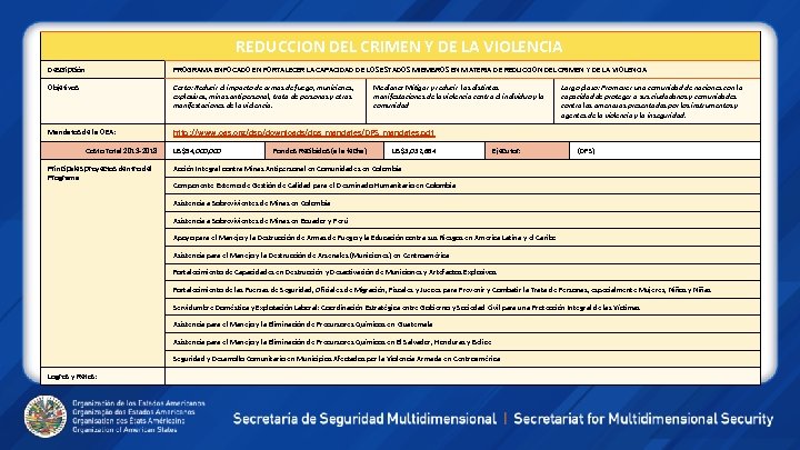 REDUCCION DEL CRIMEN Y DE LA VIOLENCIA Descripción PROGRAMA ENFOCADO EN FORTALECER LA CAPACIDAD DE LOS ESTADOS MIEMBROS EN MATERIA DE REDUCCION DEL CRIMEN Y DE LA VIOLENCIA Objetivos Corto: Reducir el impacto de armas de fuego, municiones, explosivos, minas antipersonal, trata de personas y otras manifestaciones de la violencia. Mandatos de la OEA: http: //www. oas. org/dsp/downloads/dps_mandates/DPS_mandates. pdf Costo Total 2013 -2018 Principales proyectos dentro del Programa US$54, 000 Fondos Recibidos (a la fecha) Mediano: Mitigar y reducir las distintas manifestaciones de la violencia contra el individuo y la comunidad US$3, 032, 684 Ejecutor: Largo plazo: Promover una comunidad de naciones con la capacidad de proteger a sus ciudadanos y comunidades contra las amenazas presentadas por los instrumentos y agentes de la violencia y la inseguridad. (DPS) Acción Integral contra Minas Antipersonal en Comunidades en Colombia Componente Externo de Gestión de Calidad para el Desminado Humanitario en Colombia Asistencia a Sobrevivientes de Minas en Ecuador y Perú Apoyo para el Manejo y la Destrucción de Armas de Fuego y la Educación contra sus Riesgos en America Latina y el Caribe Asistencia para el Manejo y la Destrucción de Arsenales (Municiones) en Centroamérica Fortalecimiento de Capacidades en Destrucción y Desactivación de Municiones y Artefactos Explosivos Fortalecimiento de las Fuerzas de Seguridad, Oficiales de Migración, Fiscales y Jueces para Prevenir y Combatir la Trata de Personas, especialmente Mujeres, Niños y Niñas Servidumbre Doméstica y Explotación Laboral: Coordinación Estratégica entre Gobierno y Sociedad Civil para una Protección Integral de las Víctimas Asistencia para el Manejo y la Eliminación de Precursores Químicos en Guatemala Asistencia para el Manejo y la Eliminación de Precursores Químicos en El Salvador, Honduras y Belice Seguridad y Desarrollo Comunitario en Municipios Afectados por la Violencia Armada en Centroamérica Logros y Retos: