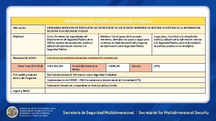 INFORMACION SOBRE SEGURIDAD PUBLICA Descripción PROGRAMA ENFOCADO EN FORTALECER LAS CAPACIDADES DE LOS ESTADOS MIEMBROS EN MATERIA DE GESTION DE LA INFORMACION RELATIVA A LA SEGURIDAD PUBLICA Objetivos Corto: Fortalecer las capacidades del Departamento de Seguridad Publica de la SSM en materia de recopilación, análisis y difusión de información relativa a la Seguridad Pública. Mandatos de la OEA: http: //www. oas. org/dsp/downloads/dps_mandates/DPS_mandates. pdf Costo Total 2013 -2018 Principales proyectos dentro del Programa US$3’, 000 Fondos Recibidos (a la fecha) Mediano: Con el apoyo de los estados miembros, identificar los pasos a seguir para comenzar la implementación del programa de Información sobre Seguridad Publica US$68, 250 Red Interamericana de Información sobre Seguridad Ciudadana Implementación de UNODC – OEA Encuesta sobre tendencias de la Criminalidad (CTS) Sistema de Indicadores comparables en América Latina y Caribe Logros y Retos: Ejecutor: Largo plazo: Contribuir a la recopilación, análisis y difusión de la información relativa a la Seguridad Publica, para la formulación de políticas publicas en el hemisferio. (DPS)