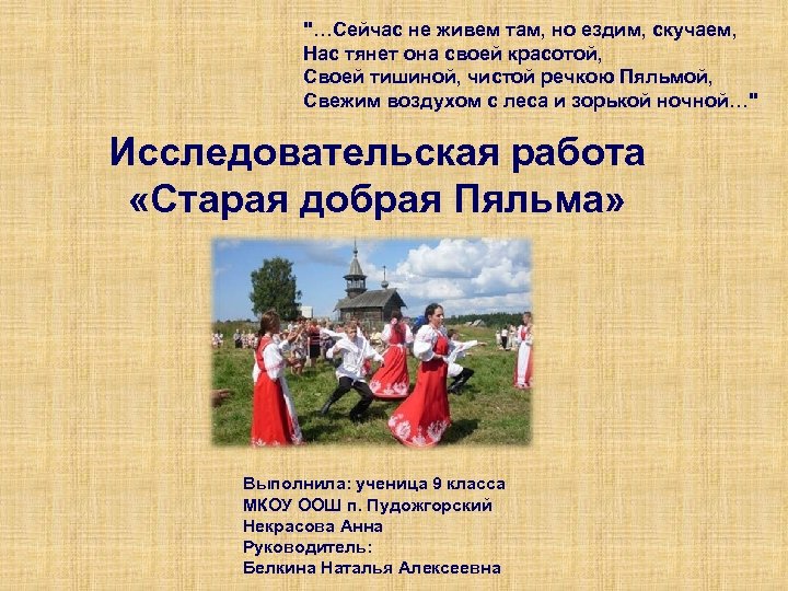 "…Сейчас не живем там, но ездим, скучаем, Нас тянет она своей красотой, Своей тишиной, чистой речкою Пяльмой, Свежим воздухом с леса и зорькой ночной…" Исследовательская работа «Старая добрая Пяльма» Выполнила: ученица 9 класса МКОУ ООШ п. Пудожгорский Некрасова Анна Руководитель: Белкина Наталья Алексеевна