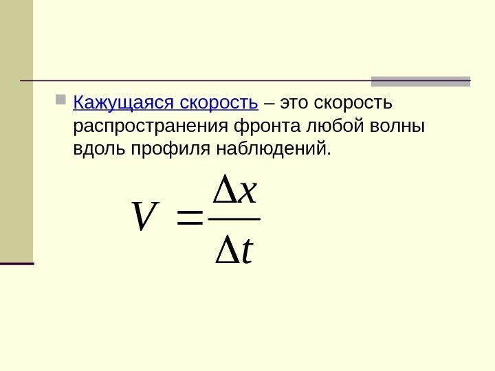Кажущаяся скорость – это скорость распространения фронта любой волны вдоль профиля наблюдений. t x V