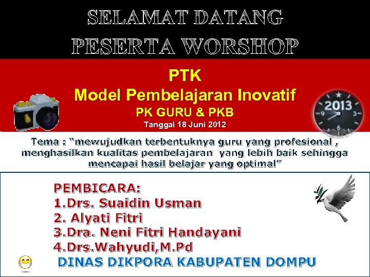 SELAMAT DATANG PESERTA WORSHOP PTK Model Pembelajaran Inovatif PK GURU & PKB Tanggal 18 Juni 2012 Tema : “mewujudkan terbentuknya guru yang profesional , menghasilkan kualitas pembelajaran yang lebih baik sehingga mencapai hasil belajar yang optimal” PEMBICARA: 1. Drs. Suaidin Usman 2. Alyati Fitri 3. Dra. Neni Fitri Handayani 4. Drs. Wahyudi, M. Pd 1 DINAS DIKPORA KABUPATEN DOMPU