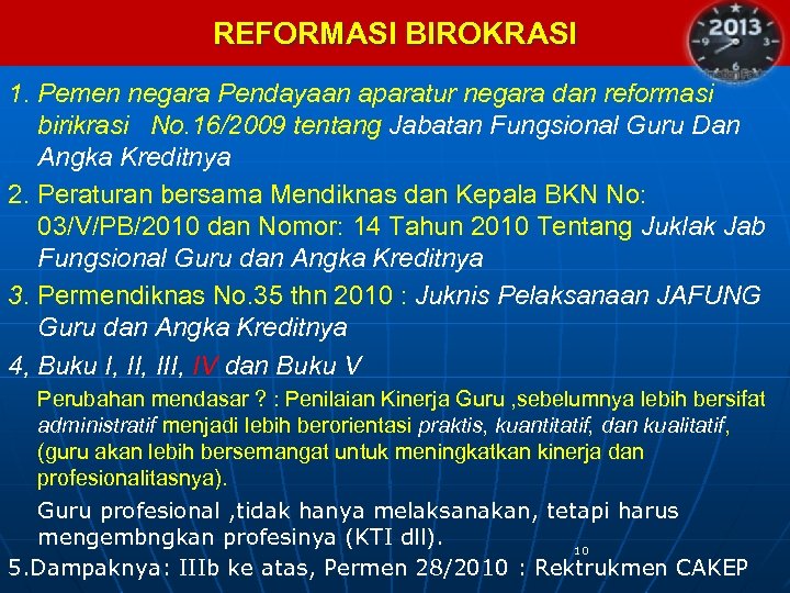 REFORMASI BIROKRASI 1. Pemen negara Pendayaan aparatur negara dan reformasi birikrasi No. 16/2009 tentang Jabatan Fungsional Guru Dan Angka Kreditnya 2. Peraturan bersama Mendiknas dan Kepala BKN No: 03/V/PB/2010 dan Nomor: 14 Tahun 2010 Tentang Juklak Jab Fungsional Guru dan Angka Kreditnya 3. Permendiknas No. 35 thn 2010 : Juknis Pelaksanaan JAFUNG Guru dan Angka Kreditnya 4, Buku I, III, IV dan Buku V Perubahan mendasar ? : Penilaian Kinerja Guru , sebelumnya lebih bersifat administratif menjadi lebih berorientasi praktis, kuantitatif, dan kualitatif, (guru akan lebih bersemangat untuk meningkatkan kinerja dan profesionalitasnya). Guru profesional , tidak hanya melaksanakan, tetapi harus mengembngkan profesinya (KTI dll). 10 5. Dampaknya: IIIb ke atas, Permen 28/2010 : Rektrukmen CAKEP